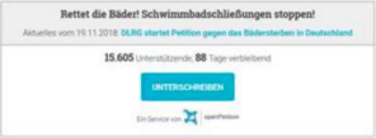 Rettet die Bäder - Schwimmbadschließungen stoppen! In den vergangenen 17 Jahren sind durchschnittlich jährlich 80 Schwimmbäder geschlossen worden. Dieses schleichende Bädersterben muss endlich beendet werden! Um dieser Forderung mehr Nachdruck und Gewicht zu verleihen, hat die DLRG eine Online-Petition gestartet. Mit dieser wollen wir möglichst viele Unterstützer gewinnen und an die gewählten Volksvertreter herantreten. Unterstützen Sie uns mit Ihrer Unterschrift. Helfen Sie uns, das Bädersterben zu stoppen! Video ... Mehr erfahren